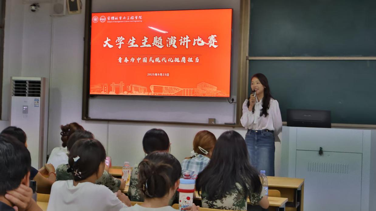为引导青年学生将个人理想融入国家发展大局,9月23日,管理科学与工程学院在教D101举办“青春为中国式现代化挺膺担当”主题演讲比赛。2025级辅导员李思雨及团委学生会部长代表担任评委。