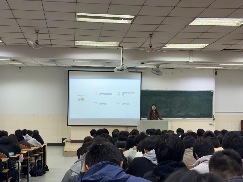 李思雨系统分析了2025-2026第一学期成绩,充分肯定了一年级同学在英语四级取得的进展,鼓励同学们进一步积极备战英语六级;通报了学业预警情况,提醒同学们正视差距、及时补缺。任静就安全管理、学业规划、创新能力培养等方面与同学们展开交流。在安全管理方面,任静结合近期高发诈骗案例,提醒同学们增强防诈意识,严守宿舍用电规范,筑牢安全底线;在学业规划方面,建议有考研、保研意向的同学从现在开始准备,主动与专业教师沟通,夯实学业基础;在创新创业方面,任静详细介绍了大学生创新创业训练计划项目等,鼓励同学们积极组队参与,将专业知识与创新实践相结合,以赛促学、以创赋能。
