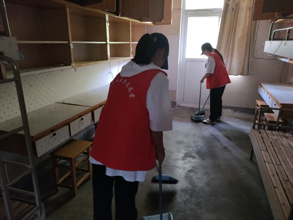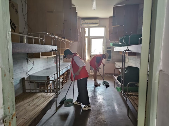 志愿者们对新生入住的宿舍楼周边环境以及寝室内进行打扫与清理。此外还仔细检查各个宿舍是否存在安全隐患及物品损坏的情况,并详细记录宿舍中存在的问题,以便于打扫结束后上报维修人员及时维修。经过志愿者们整个下午的辛勤劳动,新生宿舍全部清扫完毕。