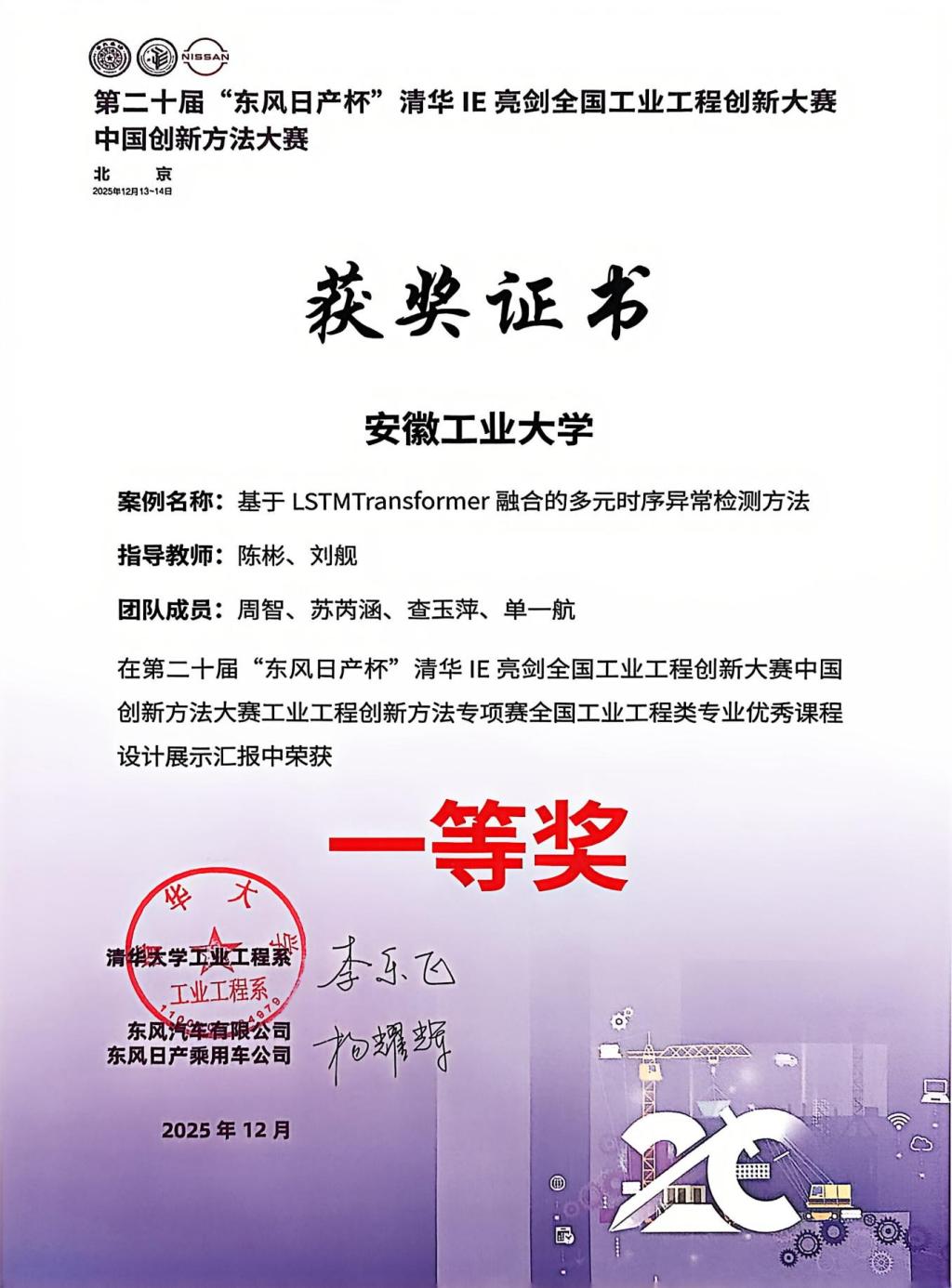 第二十届“东风日产杯”清华IE亮剑全国工业工程创新大赛在清华大学举行,面向全国工业工程相关专业高校,旨在推动工业工程创新方法在工程实践中的应用与发展。本次专项赛汇集了全国40余所高校104支队伍、452名学子踊跃参与,经过激烈角逐,共4支队伍获特等奖,12支队伍获一等奖。安徽工业大学管理科学与工程学院参赛团队立足工业实际应用场景,针对工业生产过程中普遍存在的多元时序数据异常检测难题,创新性地将LSTM(长短期记忆网络)与Transformer注意力机制进行融合建模,构建了一种兼顾时序建模能力与全局依赖捕捉能力的异常检测方法。该方法在提升异常识别准确率、降低监测延迟以及增强模型稳定性等方面表现突出,为工业流程智能监测与风险预警提供了具有实践价值的解决方案,获得评委专家的一致认可。