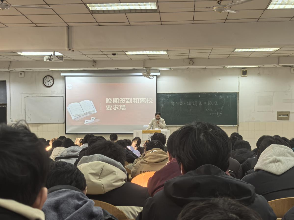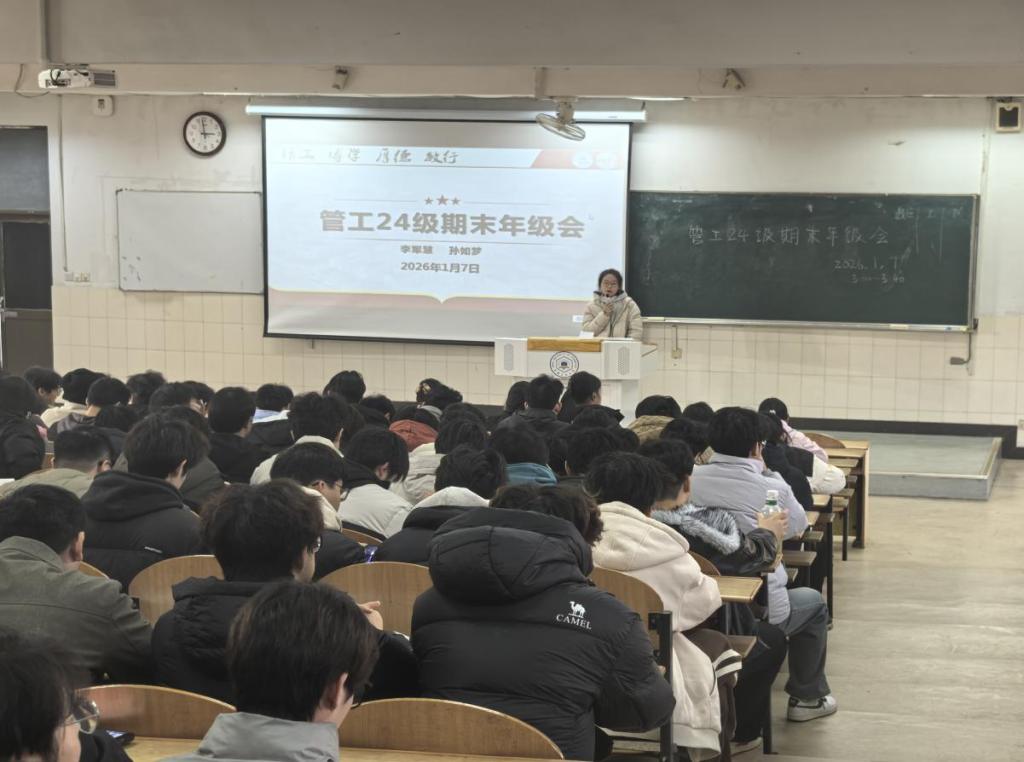 2026年1月7日,管理科学与工程学院在阶教101召开2024级“明纪守规安全笃行”期末年级会,会议由2024级辅导员李军慧、孙如梦主持,2024级全体学生参加。