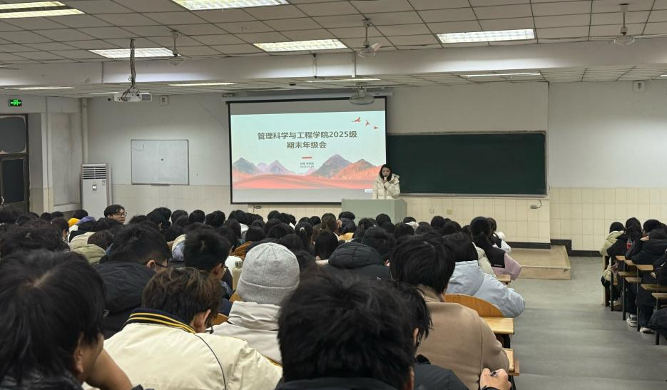 为引导大一新生从容应考、合理规划寒假生活、积极投身社会实践,1月5日,管理科学与工程学院在阶教103召开2025级期末年级大会暨寒假社会实践动员会。会议由辅导员李思雨、任静主持,2025级全体学生参加。