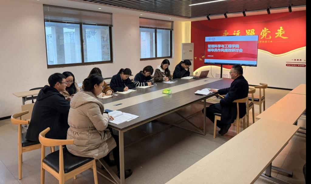 3月24日,管理科学与工程学院于汇文楼A502召开“树立和践行正确政绩观”辅导员作风提效专题研讨会。学院党委书记王军、全体辅导员参会,会议由王军主持。