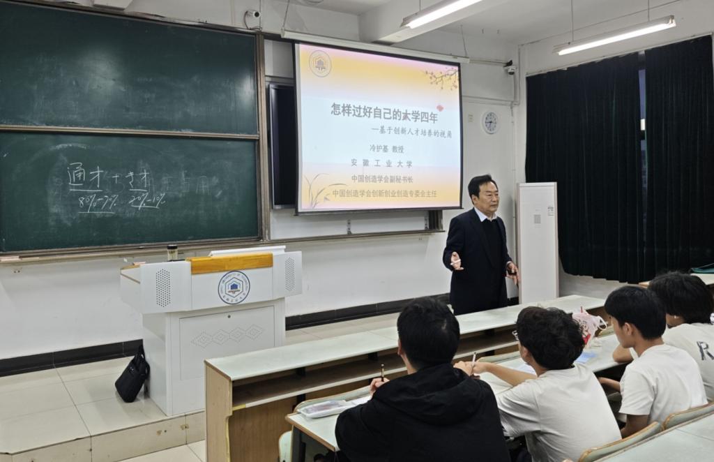 讲座中,冷护基教授强调,创新能力的基础在于广博深厚的文化底蕴,通识教育在思维构建中具有决定性作用,并针对当代大学生普遍存在的跨学科知识不足、创造性培训不够等瓶颈因素,提出了“创造性人格+创造性思维+创造性实践+创新方法+创造健康”的理想人才结构,倡导“通才+专才”的成人成才模式。冷教授通过引导学生从历史、科学、国学等维度增强文化自信,确立以通识教育为基础、专业技能为抓手的学习导向,以期成长为具备竞争潜力的复合型人才。在交流环节,冷教授深入剖析了“有形的校园教育”与社会“无形的大学”之间的内在联系,并叮嘱同学们主动打破专业壁垒,积极参加创新创业竞赛活动,将校内学习习惯转化为终身学习的硬实力。