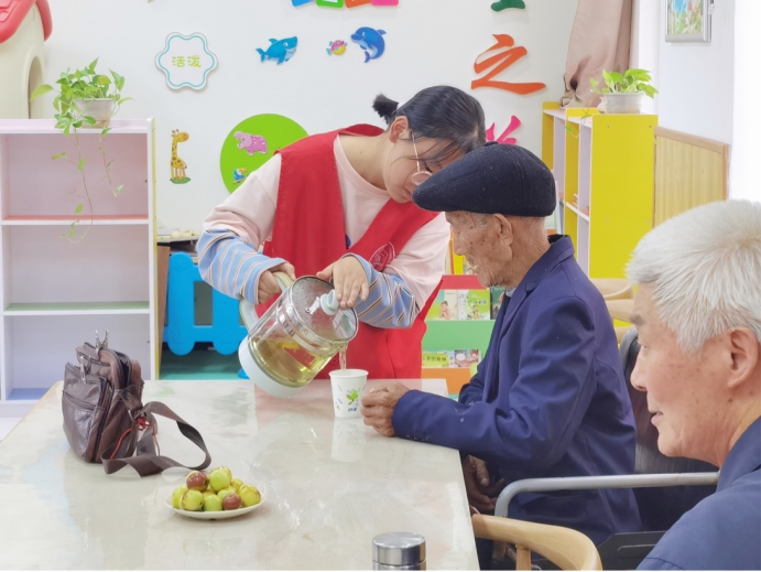 品茶。在重阳节,喝菊花茶是流传已久的习俗,为了增加节日的仪式感,志愿者为老人们送上了温暖的菊花茶。品茶中,老人们与同学们聊起了家常,同学们关切地询问了他们的身体健康状况、生活起居等方面的事情。活动结束后,志愿者与老人们一起拍照留念。临别前,老人们温情地叮嘱同学们。“天气转凉,孩子们要注意保暖。”