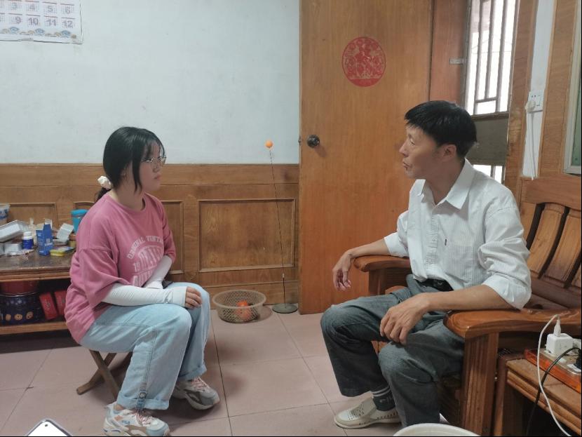 图为安徽工业大学管工学院赴岳西重温大别山革命路线团队队长李焱娜在采访当地一位老党员。